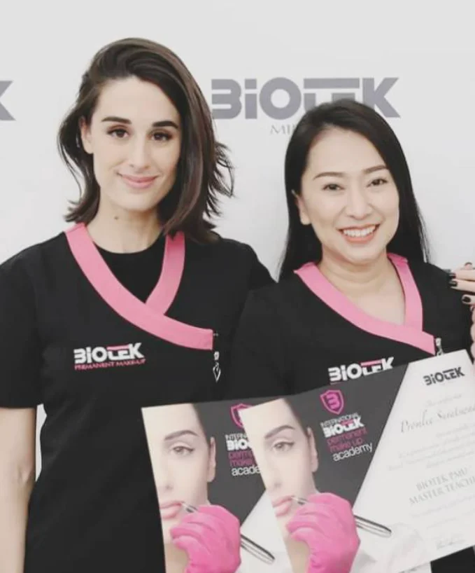 ที่ได้รับการรับรองจาก "สถาบัน BIOTEK" ประเทศอิตาลี ให้เป็นศูนย์กลางการอบรมหลักสูตร "เรียนสักคิ้วนานาชาติ" ซึ่งเป็นสถาบันสอนที่ใหญ่ที่สุด และทั่วโลกให้การยอมรับ เราได้รวบรวมหลักสูตร การเรียนสักคิ้วจากต่างประเทศไว้ในที่เดียวเพื่อรองรับนักเรียนจากทั่วโลก